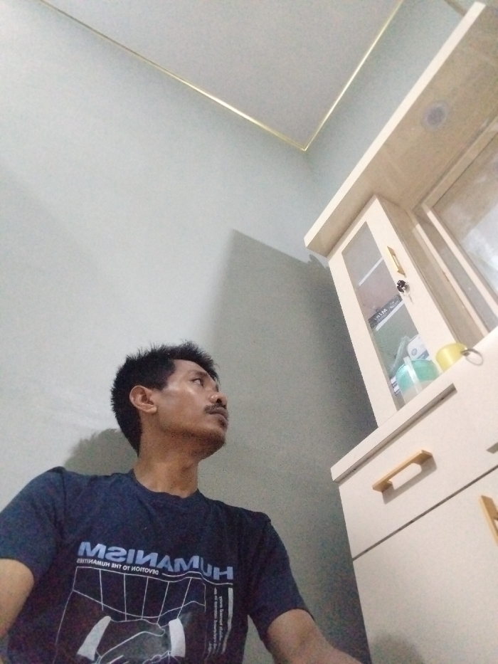 The scene is an indoor setting within a room in Kutaglumpang, Indonesia. A male individual is positioned in the lower-left quadrant of the frame, facing and looking upwards towards the right. He possesses short, dark, spiky hair, a mustache, and a medium skin tone. He wears a dark-colored t-shirt bearing an inverted white graphic design that includes the word "HUMANISM" and an illustration of hands. The room features light gray walls and a light-colored ceiling with a golden trim along the wall-ceiling junction. To the right of the male, a light-colored wooden or laminate cabinet unit is visible. The upper portion of the cabinet features glass doors, behind which a green container and a yellow cylindrical object are discernible. A key is inserted into the lock of one glass door. The lower portion of the cabinet consists of solid panels or drawers, each with a horizontal gold-colored handle. Shadows are cast on the wall behind the male figure, indicating an off-camera light source.