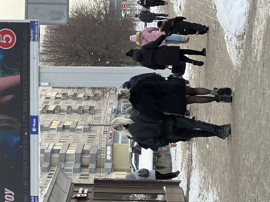 The scene depicts an urban street in Vsevolozhsk, Russia, on a winter day. The ground is covered in patches of snow and slush. In the immediate foreground, two individuals walk away from the viewer on a sidewalk. The person on the left wears a black bomber jacket, black pants, and dark, chunky-soled shoes, with shoulder-length blonde hair. The person on the right wears a black faux fur coat, black sheer tights, dark boots with thick soles, and carries a black handbag on their left arm; their hair is light blonde and pulled back. In the mid-ground, a person in a dark winter coat and pants walks while holding the right hand of a small child. The child is dressed in a dark, padded winter suit with a fur-trimmed hood. Additional pedestrians are visible on the sidewalk further down, including an individual in a pink hooded coat. To the far left, a person in a light-colored hooded jacket stands near a brown building facade. In the background, multi-story residential buildings with numerous windows and stacked balconies are visible. Commercial storefronts with Cyrillic signs, including "ОЧКИ" (Glasses), are located at street level. Parked vehicles are partially obscured by snow in the background. A large digital billboard spans the upper frame, displaying a partial advertisement with abstract green and blue elements and a red circle containing the number "5". Below this, a blue sign with "Russ" and codes "PM:25761" and "SPBB:30364 Б1" is affixed to the billboard's white structural support. Bare deciduous trees line the right side of the street.
