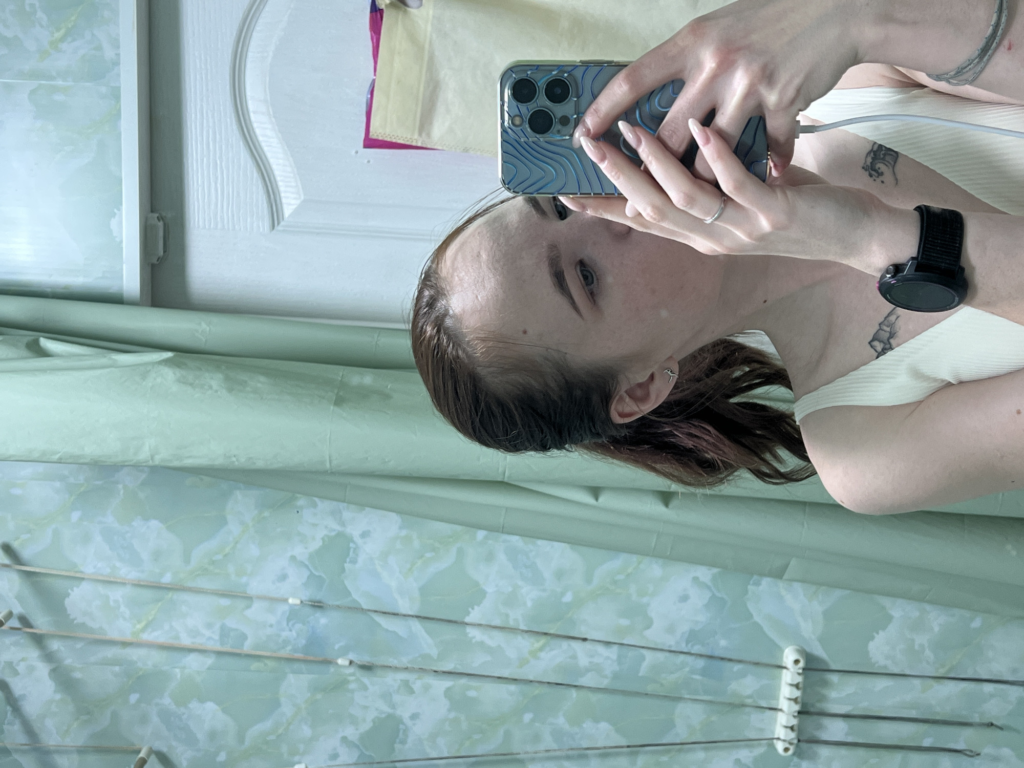 A woman takes a selfie in a room with light green walls and a white door. A clothesline is visible on the wall. The woman is holding a phone with a blue topographic pattern case. She is wearing a watch on her left wrist. The location is not discernible from the image and cannot be linked to the city of Chaikovsky, Russia.