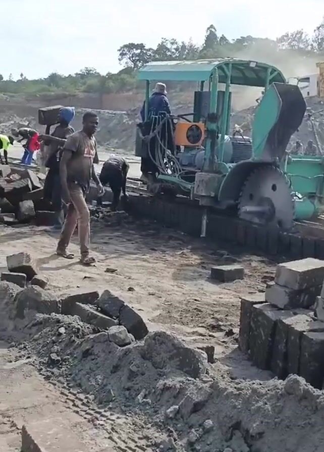 The scene shows a group of people working at what appears to be a construction site or quarry. A large, green machine with a circular saw is the central focus. The machine is operated by a person sitting on it. Several other people are around the machine, either moving or picking up gray bricks. The ground is dusty and sandy, with piles of bricks and broken pieces scattered about. In the background, there is a ridge of piled dirt and a large white truck. The sky is overcast, suggesting a daytime setting.