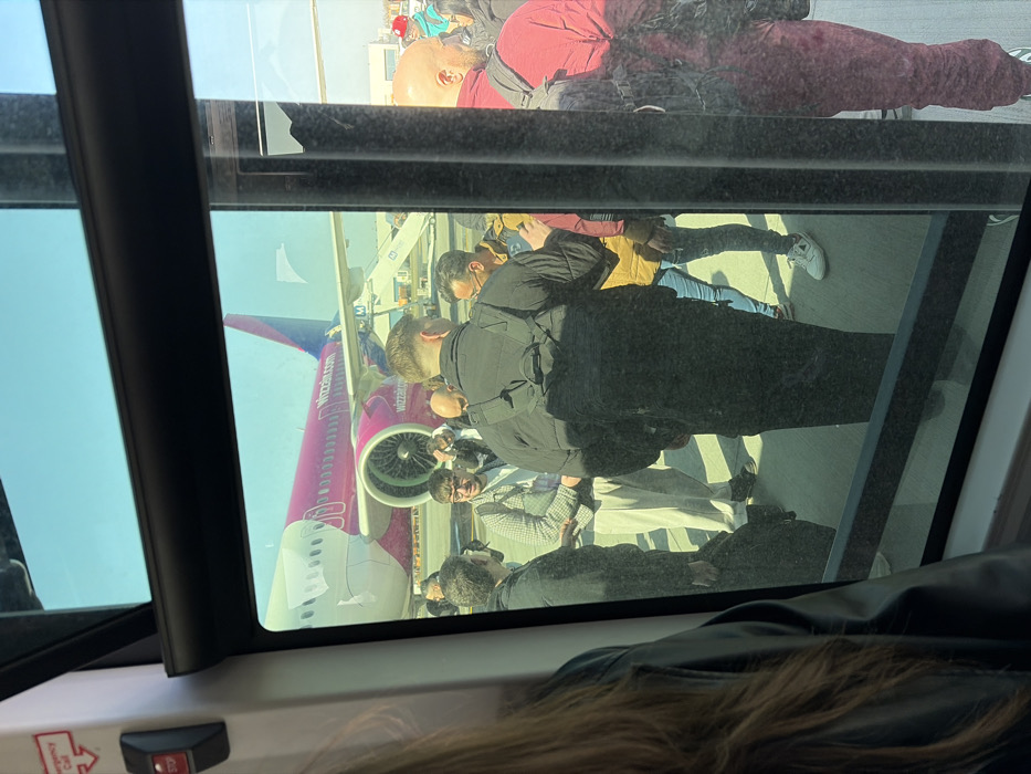 The image depicts an outdoor scene at Henri Coandă International Airport in Otopeni, Romania, observed through the window of a vehicle, likely an airport shuttle bus. In the extreme foreground on the left, the shoulder and long brown hair of an individual wearing a black jacket are partially visible, indicating the observer's position. A red "EMERGENCY CALL" sign and a red "STOP" button are affixed to the vehicle's interior window frame. Beyond the window, a Wizz Air Airbus A320 family aircraft, distinguished by its pink and white livery and "wizzair.com" branding, is parked on an asphalt tarmac under a clear blue sky. The aircraft's left engine and a mobile passenger stair positioned at the forward entry door are visible. A group of approximately 10-15 individuals, predominantly adult males, are clustered on the tarmac near the aircraft. A central figure, seen from behind, wears a black puffer jacket and a black backpack. To his left, a man with short brown hair and glasses, wearing a grey patterned shirt over a white undershirt and light grey trousers, looks towards the camera. To the right of the central figure, a man with dark hair, wearing a mustard-yellow jacket over a blue denim shirt and blue ripped jeans, is observed looking at a mobile phone. Further right, the back of a bald man wearing a red top and a dark backpack is visible. The individuals are dressed in varied casual clothing. No overt specific actions or explicit interactions among the individuals are discernible beyond their presence on the tarmac.