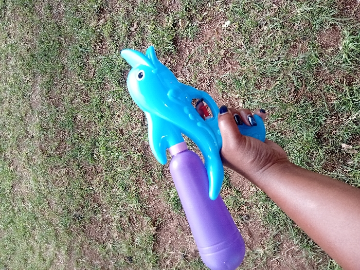 A dark-skinned hand, with dark blue polished nails, grips a blue and purple plastic toy gun, resembling a dolphin or bird. The gun is held against a blurred background of green grass and patches of brown soil. The toy is brightly colored and appears to be filled with liquid, possibly water. The composition suggests someone is about to use the toy gun.