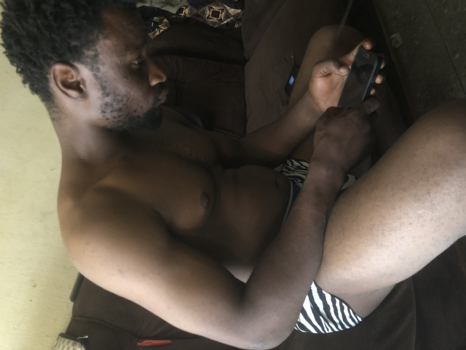 An adult male is depicted seated indoors in Sabon Gari East, Nigeria. He possesses a dark complexion, short dark curly hair, and a full beard. The individual is shirtless, wearing black and white zebra-striped underwear. He is positioned leaning forward, looking down at a dark-colored smartphone held in both hands. The man's hands are engaged with the device, suggesting interaction with its screen. He is seated on a dark brown upholstered sofa or large cushion. In the background, a light-colored, possibly beige or pale yellow, wall is visible, along with a patterned cushion on the sofa to the right. A secondary dark object, possibly another phone or remote, rests on the cushion beside him.
