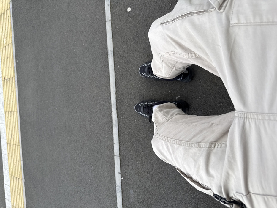 A low-angle, first-person view captures the lower body of an individual, seated or standing, looking down at their legs and feet on a dark grey asphalt surface in the city of Unknown, Unknown. The individual wears light beige cargo pants with visible seam details and black athletic shoes with white accents, over white socks. A thin, horizontal white line is painted on the asphalt directly in front of the individual's feet. Further away, towards the top of the image, a section of yellow tactile paving with parallel raised ridges is visible, bordered by a lighter strip or another white line at its upper edge.