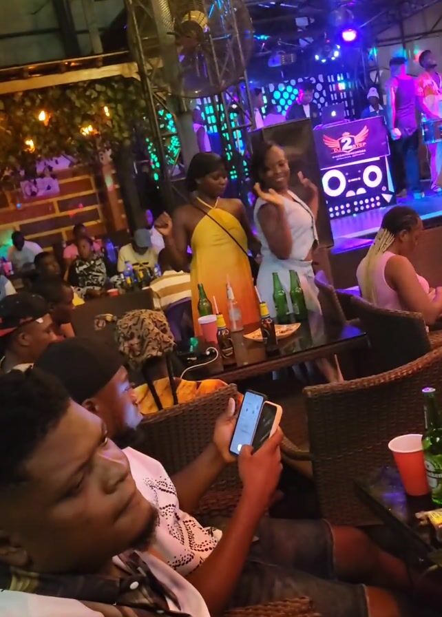 lively outdoor bar or club. Two Black women in their twenties dance near a table filled with beer bottles and a half-eaten pizza. The woman in front wears a light blue crop top and shorts, while the woman behind her wears a yellow dress. A man in the foreground sits at the table, focused on his cell phone. Other patrons sit in the background. A DJ booth is visible on a small stage, lit with blue lights. The atmosphere is energetic, with music playing.