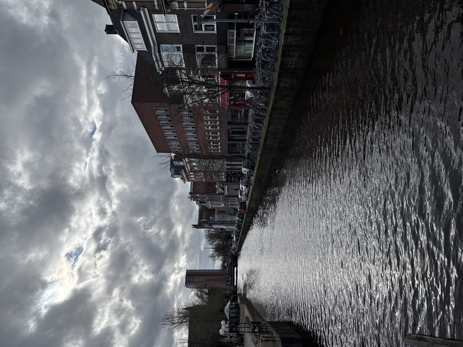 An image captured in Groningen, Netherlands, depicts an urban canal scene under an overcast sky with patches of brighter sunlight