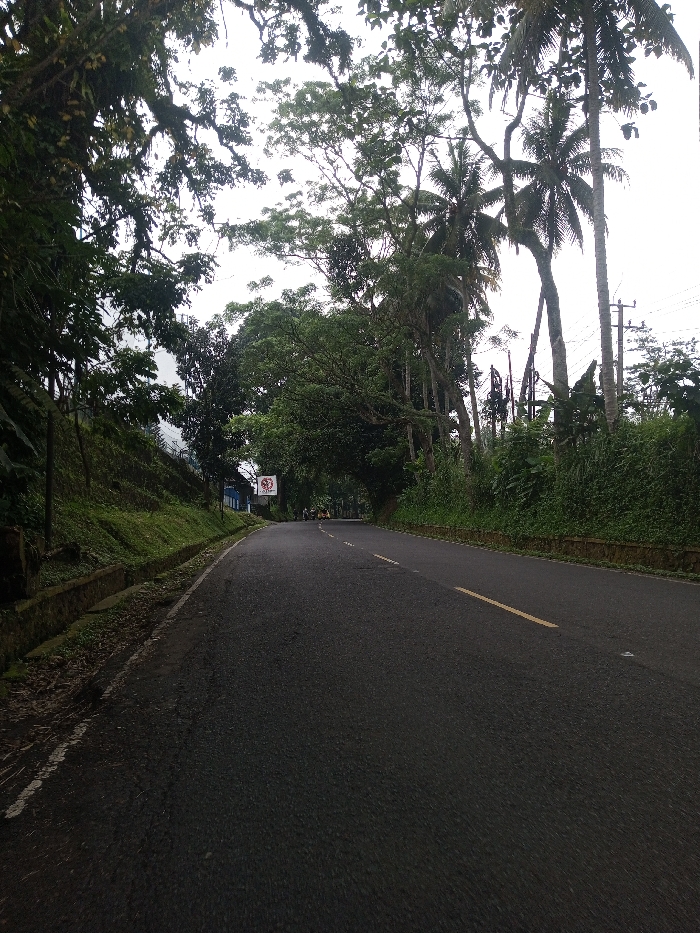 A narrow asphalt road curves gently through a verdant landscape. Lush trees with dense foliage overhang the roadway, creating a shaded canopy. A yellow line marks the center of the road. A hillside covered in greenery rises on the left, while the right is lined with thick vegetation and tall palm trees. Utility poles stand in the distance. A sign is visible near a building to the left of the road.