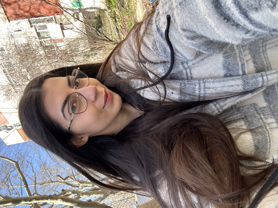 An outdoor, eye-level close-up captures a female individual, approximately in her late teens or twenties, presenting a slight smile directly towards the camera, consistent with a self-portrait. She has long, dark brown hair, parted centrally, and wears wire-frame eyeglasses with black upper rims and metallic accents. Her attire consists of a grey and white plaid shacket over a dark garment, from which a black drawstring emerges on her right shoulder. The background features an urban environment under a clear blue sky. To the left, numerous bare tree branches are visible, suggesting late winter or early spring, with a hint of a street below. To the right, a multi-story residential building, light-colored with red-orange sections and multiple windows, stands partially obscured by a leafless tree or bush. Green graffiti is present on the lower right portion of the building. The ground in the foreground right displays green foliage and scattered dry debris. The scene is located in the city of Varna, Bulgaria.
