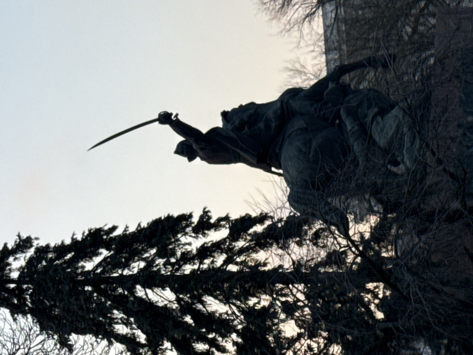 The image displays an outdoor scene featuring the Monument to Mikhail Vorontsov in Rostov-on-Don, Russia, located at Gagarin Square. The central subject is a large, dark-colored equestrian statue. The statue depicts a male figure, presumed to be Mikhail Vorontsov, mounted on a horse. The figure wears a long coat and a distinctive cap. His right arm is raised high, gripping a saber or sword. The horse is depicted in a dynamic, rearing pose. To the left of the statue, a tall, dark coniferous tree stands in silhouette. The lower portion of the statue and the immediate foreground are partially obscured by a dense network of bare, dark branches from deciduous trees. The background consists of a uniformly light, overcast sky. A light-colored building with visible architectural details is faintly discernible through the bare branches on the right side of the frame. The overall lighting renders the statue and foreground trees in silhouette against the bright sky.