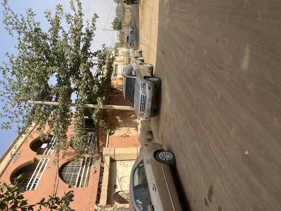 The scene depicts an outdoor street view in Fagge D2, Nigeria, under clear, hazy daylight conditions. The foreground consists of an unpaved, reddish-brown dirt road showing visible tire impressions. On the left, a two-story building, painted a peach or light orange color, features arched architectural elements. The ground floor displays windows secured with white metal grates. The second floor has two prominent arched balconies with white railings; laundry, including dark and light garments, hangs to dry on the rightmost balcony. Above these balconies, a sign identifies the building as "OSINACHI". The property is fronted by a low wall, also peach-colored, topped with coils of razor wire. A large, dark wooden gate is partially visible at the far left on the ground level. A large, dense green-leafed tree stands centrally, partially obscuring the building's facade. Adjacent to the tree is a light-colored utility pole supporting power lines. Three vehicles are parked along the dirt road. In the mid-ground, a silver Toyota Highlander SUV, bearing license plate "BDN-388TG", is parked facing the camera. Behind it, a lighter-colored SUV is partially visible. To the left, a beige sedan (likely a Toyota Corolla) is parked, with its rear three-quarters visible. Further down the road on the right, a silver sedan is parked near a distant, low wall. In the far background, on the right side of the road, a lone individual wearing dark attire is walking away from the camera. The sky is a light, hazy blue, indicative of a dry environment.