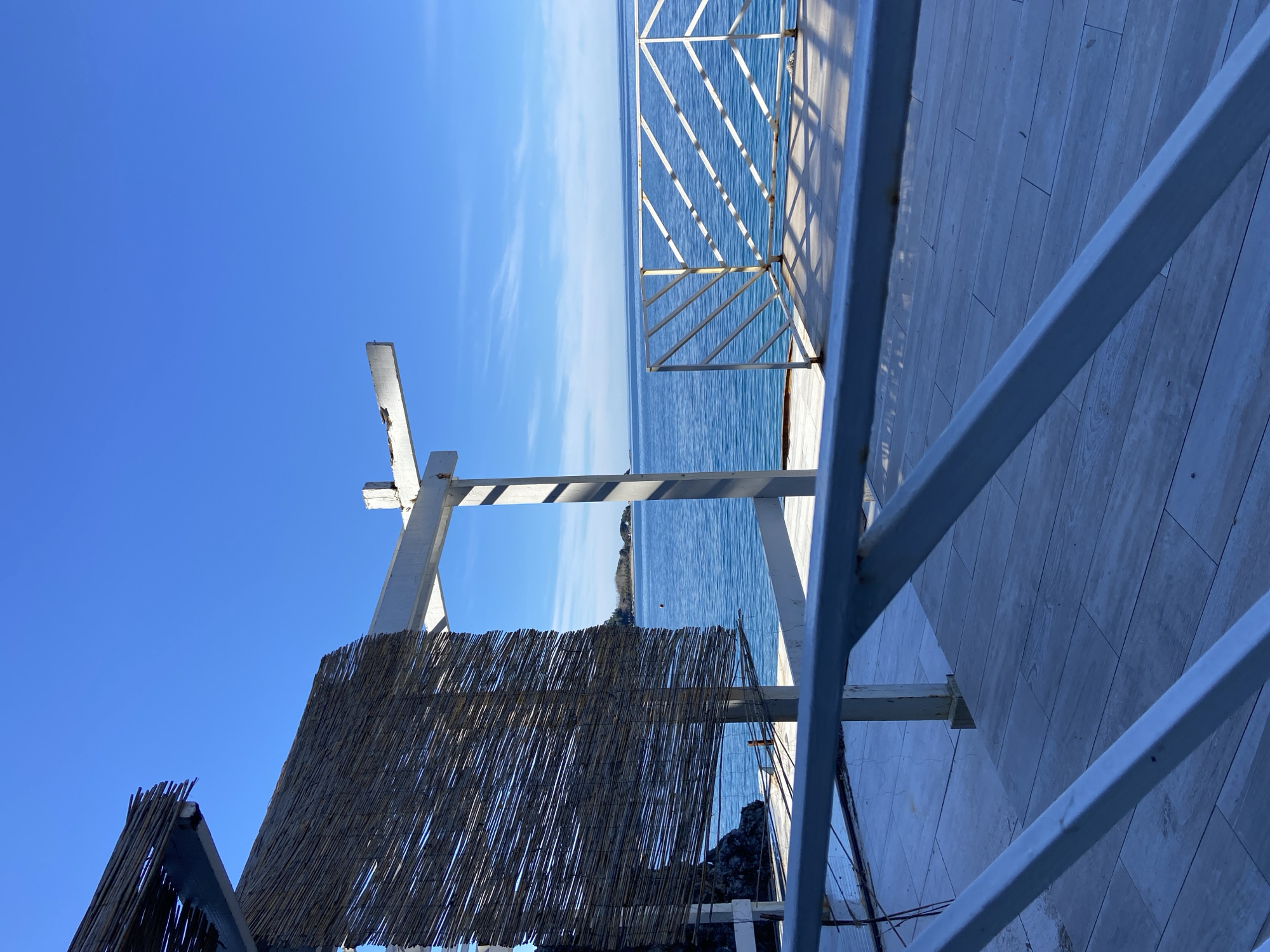 The image, likely taken at the city of Budva, Montenegro, depicts a coastal scene from an elevated perspective. The view includes a clear blue sky, a calm sea, and parts of a building or structure. Foreground: The structure appears to be a deck or patio with white railing. The flooring is made of what seems to be white tiles. There's also a reed or woven covering partially obscuring the view. Background: The blue sea stretches to the horizon under a bright blue sky. In the distance, there's a rocky headland or small island. Overall: The image presents a serene coastal view, with architectural elements framing the natural landscape.