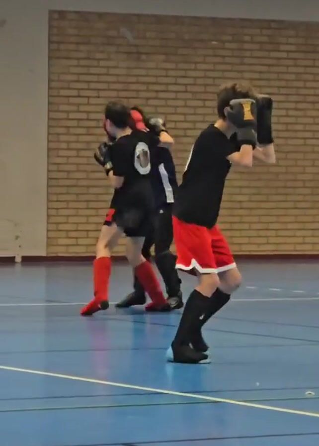 - "four boys, possibly practicing kickboxing, in a gymnasium with a brick wall and a blue floor marked with lines" by FM-dTRWD3, licensed under CC BY 4.0