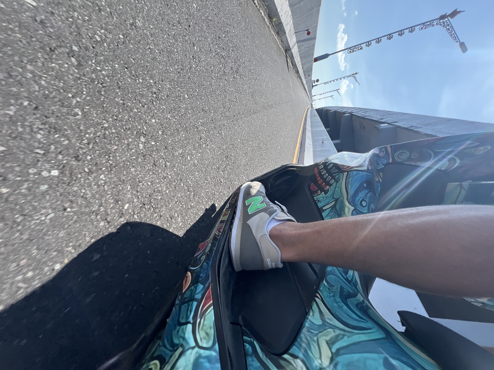 A first-person perspective photograph shows a person's leg and foot wearing a gray and white New Balance sneaker resting on a multi-colored patterned surface, possibly the dashboard or side of a vehicle. The photograph appears to be taken while the vehicle is in motion, as indicated by the blurred asphalt road visible to the left. The perspective is distorted, making the road seem to rise vertically. Beyond the road, a concrete barrier and decorative streetlights extend into the distance against a partly cloudy sky. I cannot determine the precise location within Denpasar, Indonesia based on the given image.