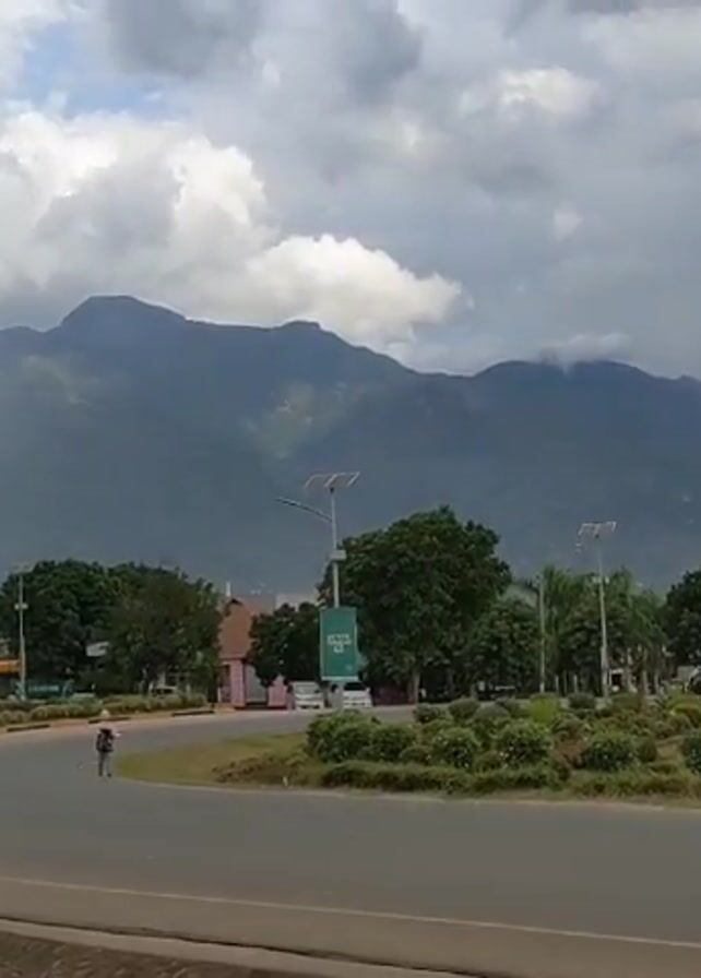 road circling a traffic island with mountains in the background under a cloudy sky. Along the road, there are cars, a person running, motorbikes, and small three-wheeled vehicles known as auto rickshaws or tuk-tuks. The traffic island features trees, bushes, solar-powered streetlights, and decorative animal sculptures including a giraffe. A hotel is visible in the background, to the left.