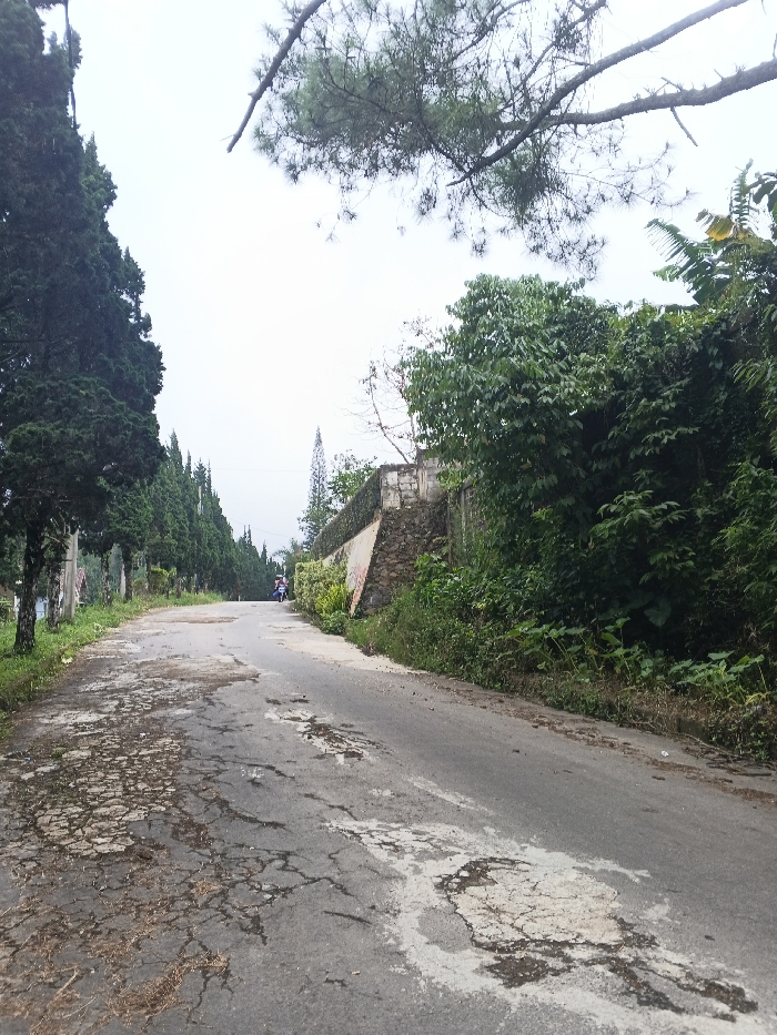 A ground-level photograph depicts a weathered asphalt road in Candelaria, Philippines, under an overcast sky. The road surface exhibits extensive cracking, patches, and exposed aggregate, with scattered dry vegetation and debris on the left shoulder. To the left, a linear arrangement of numerous tall, dark green coniferous trees borders the road, forming an avenue that extends into the distance. To the right, a retaining wall constructed from concrete blocks and natural stone is largely obscured by dense, varied green foliage, including broadleaf trees and undergrowth. A distant, slender conifer is visible behind the wall. Approximately 50-70 meters down the road, two individuals are discernable on a light-colored motorcycle, appearing to be stationary or moving slowly. Overhanging pine branches with needles are present in the upper right foreground.