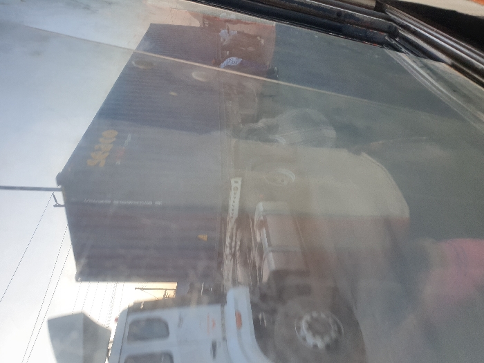 A container truck is seen through a hazy, reflective surface. The container has yellow lettering, partially obscured. The truck cab, white with visible details like wheels, is in the foreground. Power lines are visible in the background, contrasting with the sky. The overall image is distorted by the reflective surface.