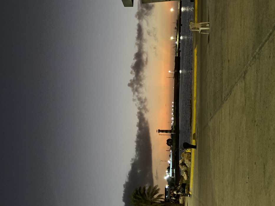 This image depicts a port scene at dusk or early night in Punta de Piedras, Venezuela. The sky transitions from dark grey at the top to an orange-red glow near the horizon, indicative of sunset, with dark grey clouds horizontally traversing the mid-sky. In the foreground, a concrete pier or dock extends across the lower portion of the frame. A bright yellow line marks the edge of the pier alongside the water. To the far right on the pier, a single white plastic chair is positioned, facing the water. Slightly to the left of the center, a dark bollard is visible on the pier. Further left, near a collection of large, light-colored rocks, a person is observed bending over, facing the water. To their immediate left, a group of approximately four individuals stands or sits near the rocks and the base of a palm tree, which is partially visible on the far left. Across the body of water, a distinct lighthouse with red and white horizontal stripes stands prominently, illuminated against the sunset glow. Numerous lights from structures and possibly other boats are visible along the distant shoreline and on the water, reflecting the illumination. Several dark silhouettes of boats are discernible on the water, including what appears to be a larger sailing vessel further to the right of the lighthouse. The water surface is dark, with reflected lights creating bright streaks.