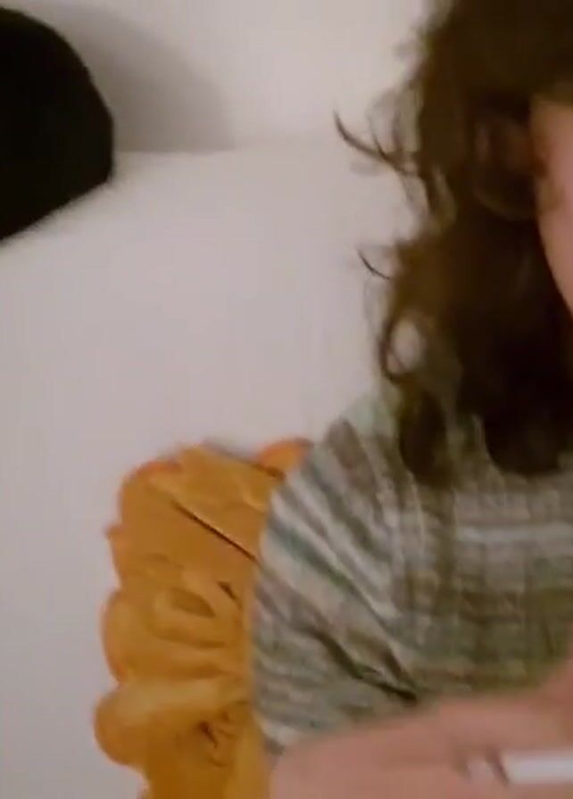 A person with shoulder-length curly brown hair is holding a cigarette and looking at the camera with a slight smirk. They are wearing a green and grey striped sweater and sitting on a white couch. Behind them, on the back of the couch, a black and white cat is lying down. To the left of the person is a wrinkled orange fabric. The room appears to be indoors.