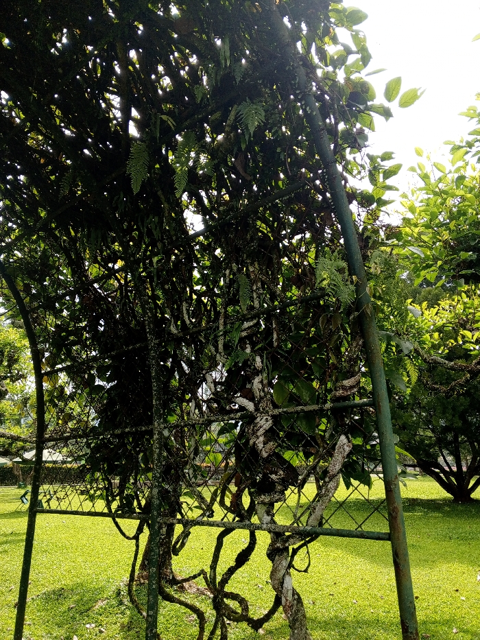 A lush, overgrown archway stands amidst a vibrant green lawn. The structure is obscured by dense foliage, including ferns and vines. Twisted, gnarly roots and vines are wrapped around the metal framework, adding an organic, almost surreal quality. Bright sunlight illuminates portions of the scene, dappling the greenery with light and shadow. A glimpse of a distant tree and person can be seen through the foliage.