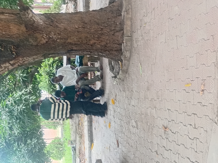 The scene depicts three adult males gathered outdoors in Ukukwa, Nigeria, on a paved surface of interlocking pavers. A large tree trunk occupies the right side of the foreground, providing shade under its canopy, which extends into the background. One male stands on the left, wearing a green and white horizontal striped long-sleeved shirt and dark trousers. He holds a dark object, likely a mobile phone, to his right ear, facing away from the camera. Two other males are seated on a low wooden bench or similar structure to the right of the standing male, positioned under the tree. The male closer to the center wears a dark green polo shirt and dark trousers, appearing to look down at an object held in his hands. The male seated to his right wears a white polo shirt and light-colored trousers, with his gaze directed towards the male in the green shirt. The ground is covered with light-colored interlocking pavers, with several yellow and brown dried leaves scattered across the surface. In the background, beyond the subjects, green foliage and distant structures are visible under what appears to be an overcast sky.