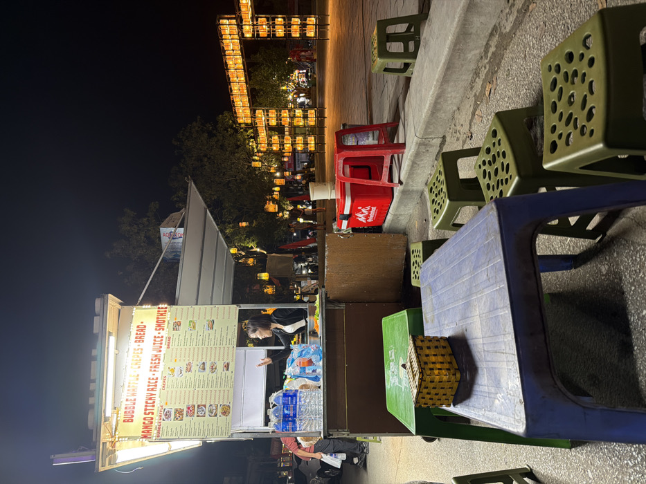 The image depicts an illuminated street food scene at night in Nam Hoa Lư Ward, Vietnam