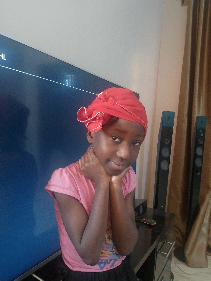 A young female, appearing to be a child, stands facing the camera in an indoor domestic setting. She has dark skin and wears a red fabric headwrap, styled with a prominent knot above her left temple. Her attire includes a short-sleeved pink t-shirt with a multi-colored graphic design on the chest and a dark-colored lower garment. Her hands are clasped at her neck/jawline, with her elbows bent. She presents a slight smile. The background features a large, dark flat-screen television to her left, displaying minimal white text "HL" and a thin horizontal line on its upper left portion. Beneath the TV is a dark, glossy entertainment console with metallic drawer pulls. To the child's right, two tall, dark-colored floor-standing speakers are positioned upright, each with visible circular speaker components. A multi-colored remote control rests on the entertainment console between the child and the rightmost speaker. Light brown or gold-colored curtains are visible on the far right, indicating a window or opening. The walls are a light, neutral color. The scene depicts a contemporary residential interior, consistent with a home in an urban environment such as Jos, Nigeria. There are no specific landmarks or unique architectural features within the image to pinpoint an exact location within the city of Jos.