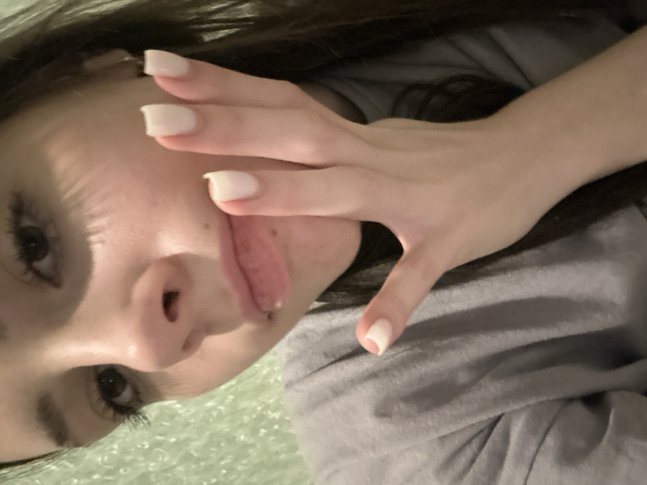 A woman's face dominates the frame, tilted sideways. She is sticking her tongue out, and her hand with manicured nails is partially obscuring her face. The background appears to be a light green textured surface on the left and a gray fabric on the right. Her expression is playful. The lighting is soft, casting some shadows on her face.