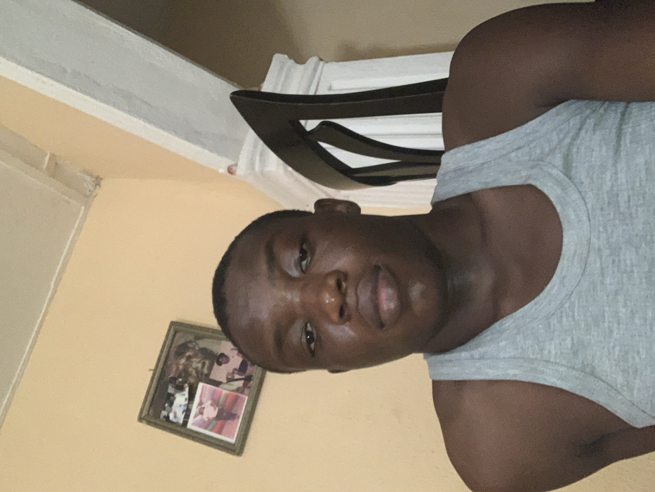 An indoor portrait displays a young adult male, of dark complexion with short dark hair, positioned centrally and looking directly into the camera with a neutral expression. He wears a grey ribbed tank top. The background features a light yellowish-beige wall. To the upper left, a dark-framed picture containing multiple smaller photographs hangs, slightly tilted. To the right, a white architectural column or beam with decorative molding is partially visible, along with a portion of a dark-colored chair back. The ceiling is off-white. This scene is located in the city of Ijegun, Nigeria.