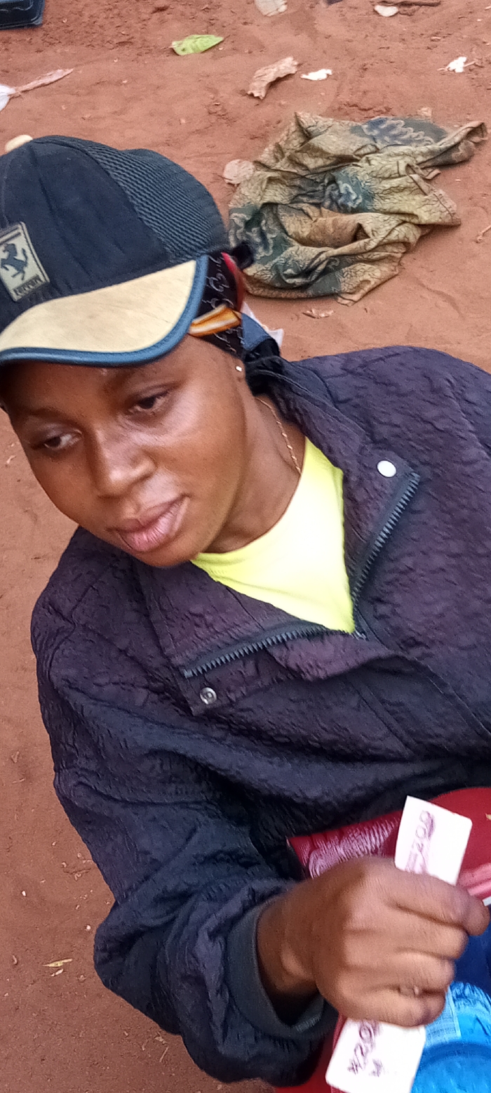 The image depicts an adult female in the city of Unknown, Unknown, viewed from a slightly elevated perspective. She wears a dark blue baseball cap with a beige brim featuring a green Ferrari logo, a multi-colored patterned headscarf, a bright yellow t-shirt, and a dark blue textured jacket with a zipper and snap closure. A thin gold-colored chain is visible around her neck, and a small stud earring is in her right ear. Her gaze is directed downwards and to her left. Her right hand, positioned in the lower right portion of the frame, firmly holds two light-colored banknotes, identifiable as NGN 200 denominations, over a red object. The immediate background and ground surface consist of reddish-brown earth, scattered with a crumpled piece of patterned greenish-brown and blue fabric, a light green leaf, and several small, irregular fragments of light-colored debris.
