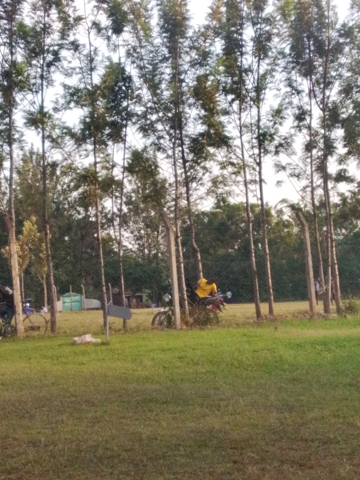 A line of tall, thin trees stretches across the background. A wire fence with concrete posts is visible. A man in a yellow shirt is sitting on a motorcycle behind the fence. Bicycles and other indiscernible figures are also present. In the foreground is a grassy area. The sky appears hazy or overcast. A small building or structure can be glimpsed in the distance.