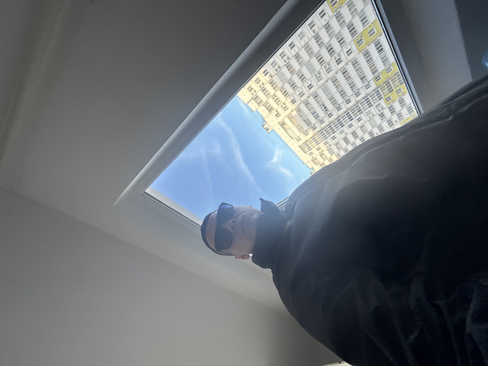 The image displays a low-angle, tilted perspective from an interior location, looking outwards through a window. A single individual is partially visible in the upper-left and central-left portions of the frame, positioned above the window. This individual wears a dark, long-sleeved garment and dark sunglasses; specific facial features are indistinguishable due to lighting and angle. The interior space features plain, light-colored walls and ceiling, illuminated by natural light. Through the white-framed window, a clear blue sky with faint white contrails is visible above a large, multi-story residential building. This building, likely an apartment complex, exhibits a light-colored facade with yellow or light-orange accent panels and numerous windows and air conditioning units. The individual appears to be observing the external environment through the window. The depicted scene is located in Anapa, Russia.