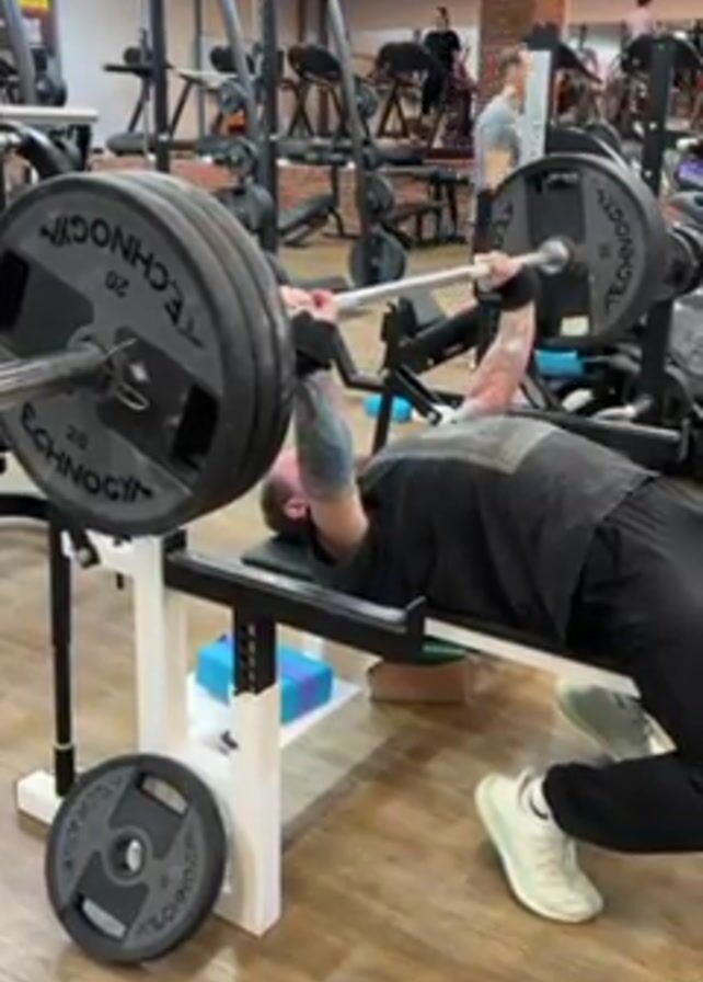 Here is a detailed description of the video: The video shows a man in a gym doing a bench press