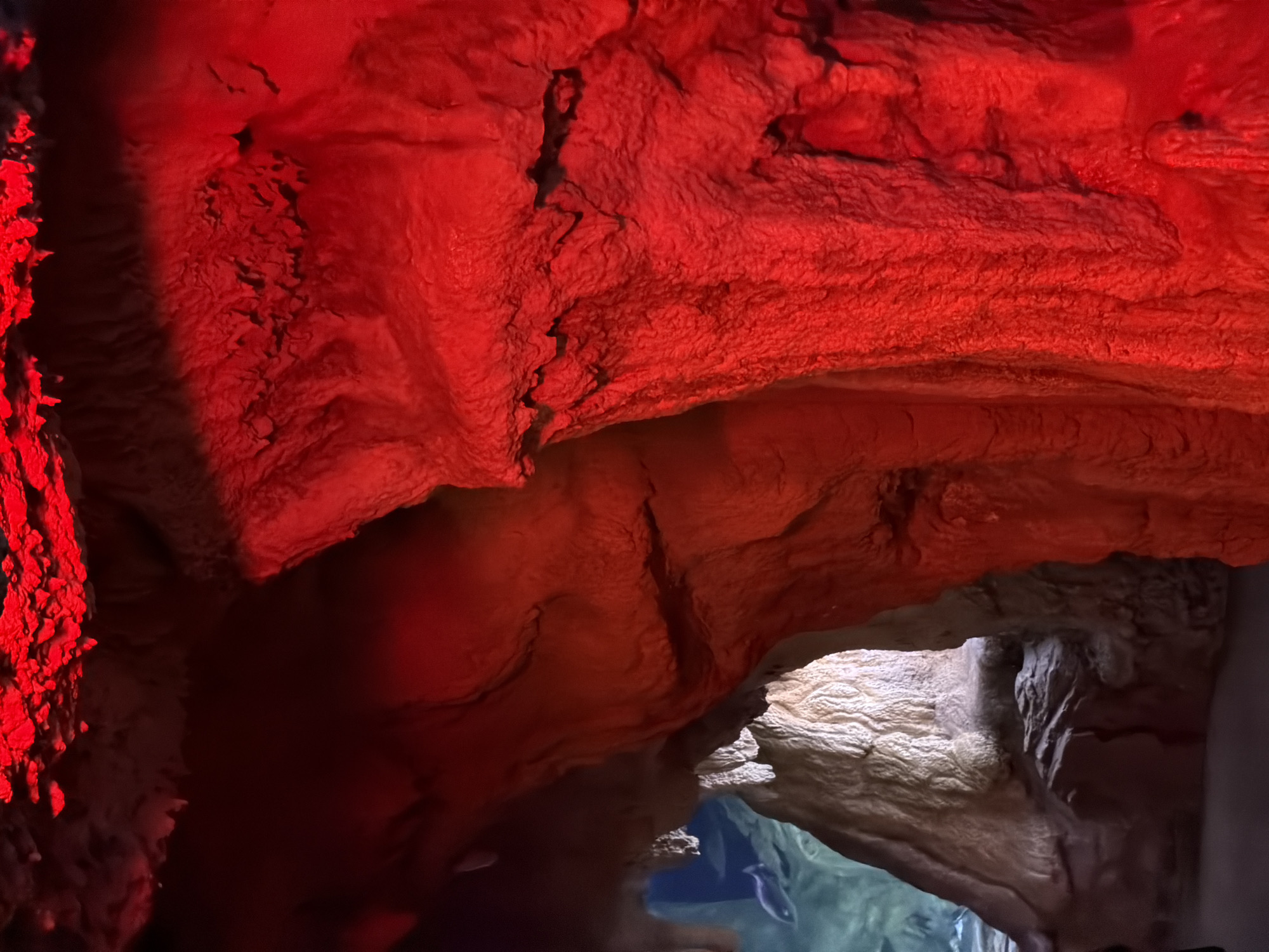 n underwater scene, possibly an aquarium exhibit. Above the water, there is a simulated cave structure with a rough, textured surface illuminated by red light. This creates a stark contrast with the lighter, neutral-toned rock formations closer to the water's surface. Below, the water is visible, with some marine life, likely fish, visible through the clear water. The context of Bakırköy, Turkey, suggests this is most likely an indoor aquarium exhibit.