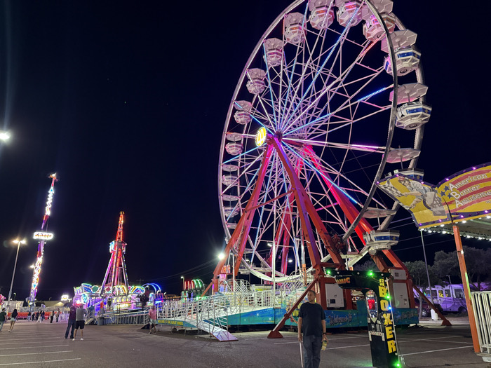 A vibrant nighttime scene at a fair features a large Ferris wheel illuminated with multicolored lights. Smaller, similarly lit carnival rides stand in the background, with scattered fairgoers visible in the foreground. A man stands near the base of the Ferris wheel. The scene is captured at dusk or night, with the rides and the fair drawing attention amidst the darkness.