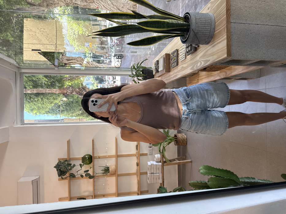 The image depicts the interior of a retail establishment, identified as a handmade jewelry store or workshop, located in the city of Unknown, Unknown. A single individual is visible in a mirror selfie, partially obscured by a white smartphone with a triple camera and MagSafe ring, which is held to cover her face. She wears a light brown ribbed tank top, light blue denim shorts, and a silver-colored necklace. The store's interior features light gray tiled flooring and white walls. A white air conditioning unit is mounted high on the left wall. A light wood shelving unit along the back wall displays potted plants and various white boxes. To the left, a rustic wooden table also holds stacked white boxes and a potted plant in a wicker basket. On the right, a prominent display counter, constructed from gray cinder blocks with a light wood top, exhibits numerous small items, primarily jewelry. A tall snake plant in a corrugated gray metal pot stands on this counter. A large cactus-like plant is reflected in the mirror on the far left. Through a large window on the right, an exterior street scene is visible under sunny conditions, featuring tall trees, including palm trees, vehicles, and parked bicycles. The reflection on the window includes partial text reading "HANDMADE JEW" and "WORKSHOPS."