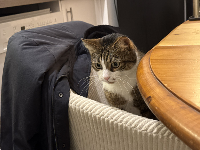 - "A striped tabby cat sits in a corduroy chair, partially obscured by a dark blue coat" by FM-EvMDo2, licensed under CC BY 4.0