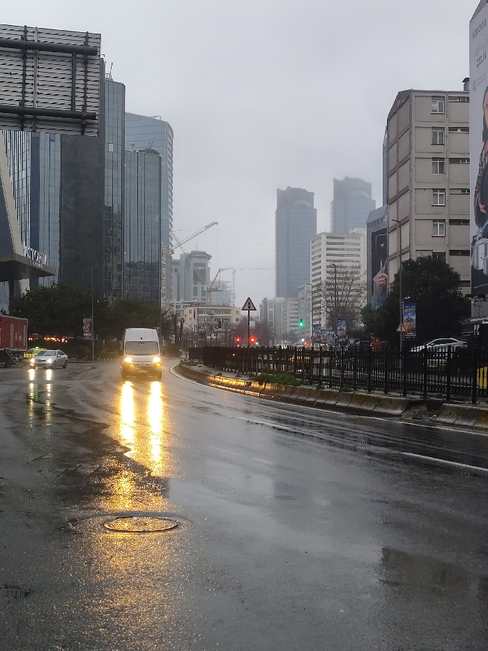 A wet, grey urban street scene shows vehicles moving towards the viewer. A white van dominates the foreground, headlights reflecting brightly on the rain-slicked asphalt. Tall buildings, some modern glass structures and others older, line the street under a cloudy sky. Streetlights, traffic signals, and guardrails add to the urban landscape. A circular manhole cover is visible on the street. Construction cranes are present in the distance, suggesting ongoing development.