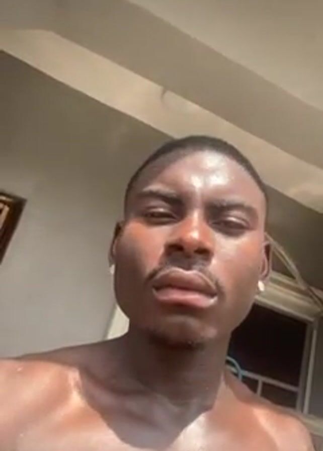 A close-up, low-angle shot shows a shirtless man with dark skin, a mustache, and a short haircut