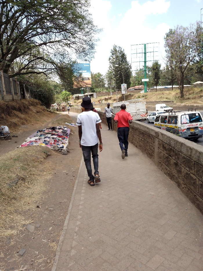 The image presents an outdoor daytime scene in the city of Unknown, Unknown, depicting a street with pedestrian and vehicular traffic. A paved walkway runs from the foreground towards the background, bordered on its left by a dry dirt path and on its right by a low, weathered concrete retaining wall. Three male individuals are present on the paved walkway. The closest, viewed from behind, wears a black bucket hat, a white t-shirt with black striped sleeves, dark jeans, and brown sandals, walking away from the camera. Ahead of him, a second male in a red short-sleeved shirt and dark trousers walks briskly in the same direction. Further down the walkway, a third male in a light-colored t-shirt is partially visible. To the left of the dirt path, beneath the canopy of large trees, an informal market stall displays a large array of colorful clothing and fabrics spread directly on the ground. Several indistinct figures are visible near this display in the background. Beyond the retaining wall on the right, a multi-lane asphalt road carries traffic. Vehicles present include a white cargo truck and a white passenger van with colorful decals and the word "CHIMWEMWE" visible on its rear. In the mid-distance, a large billboard advertising "BACHA" and "EXPREME" is visible on the left, while an empty green metal billboard structure stands on the right. The sky overhead is partly cloudy, and the overall environment includes both urban infrastructure and natural vegetation.