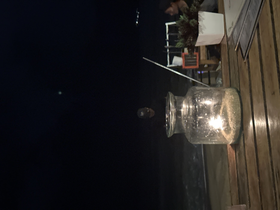 The image depicts a nighttime scene at a beachfront establishment in Baan Bo Phut, Thailand. The foreground features a wooden table where a clear glass jar, containing sand and a lit candle, serves as a central luminary. To the right of the candle, a white square pot holds a small green plant, and a stack of menus or papers is partially visible. The midground reveals the dark ocean with faint waves lapping against the shore. A blurry, dark-skinned individual stands in the shallow water or on the wet sand, facing away from the camera. Further right, a partial view of a person's head and shoulder is visible, seated at another table or structure, looking towards the left. A light-colored pole leans against an indiscernible structure in the midground right. The background consists of a dark night sky, with a single faint green light source present in the upper left, and a few distant, small lights visible across the dark water on the horizon.