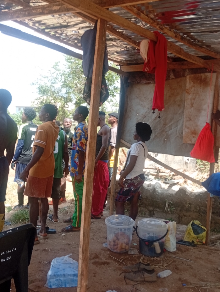 An outdoor, makeshift shelter in Asaba, Nigeria, is depicted under bright daylight. The shelter features a corrugated metal roof supported by rough-hewn wooden beams. Fabric or tarpaulin serves as partial walls. Approximately twelve individuals, predominantly male, are present within or immediately adjacent to the shelter. On the left, a group of males stands, most looking towards the left or forward. These include a male in a dark jersey with "19" visible, another in an orange shirt and shorts, a male in a green shirt, and a male in a colorful patterned shirt with green pants. A male in a black tank top and red pants faces right. On the far right, a female in a white top and patterned skirt stands, facing right. Suspended from the wooden beams are various items of clothing, including a dark jacket, a red tracksuit top, and a light-colored cap, along with a dark patterned bag and a red bag. On the dirt ground within the shelter, several objects are visible. To the right, two transparent plastic buckets with lids sit; one contains light-colored food items, and the other is dark internally. Adjacent to these are a yellow plastic bag, another white bag, a pair of brown lace-up shoes, and a plastic bottle. To the left, a clear plastic bag containing multiple smaller clear sachets, possibly water, rests on the ground next to a black plastic chair bearing the inscription "OTIGBA FC UNITED". The background reveals green foliage from trees and a partial view of a light-colored building under a clear sky. The ground throughout the scene is dry earth. Individuals appear to be standing, some observing, in a casual gathering.
