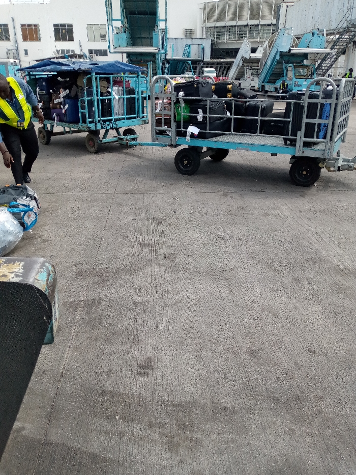The scene depicts an airport tarmac area, likely at Gwaska International Airport, Nigeria. In the foreground, a textured concrete surface occupies the lower half of the frame. To the left, a person, partially visible and wearing a high-visibility yellow vest over dark clothing, appears to be in motion, bending slightly forward or passing by luggage. Several pieces of luggage, including one wrapped in clear plastic, are visible on the ground near this individual. Dominating the midground are two light-blue baggage carts with metal frames, hitched together in tandem. The cart closer to the background features a blue tarp canopy and is heavily laden with assorted luggage, primarily dark-colored suitcases and bags. A numerical designation, "1305", is visible on its side. The second cart, positioned to the right and slightly closer to the viewer, is also filled with numerous dark-colored bags and suitcases. In the background, an airport terminal building with white walls and various structures, including ventilation units, is visible. Adjacent to the building, multiple light-blue mobile passenger stairs (air stairs) are present, indicating aircraft boarding/disembarking operations, although no aircraft are visible. The overall lighting suggests an overcast or bright daytime condition.