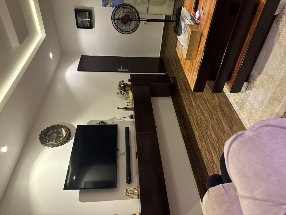 A living room features a television mounted on a white wall alongside a decorative clock and a tall, dark-colored entertainment unit. A floor fan stands near a dark brown door. A wooden coffee table with a distinctive design sits on a patterned rug. The floor is a warm wood tone, and a portion of a light-colored armchair is visible in the foreground.