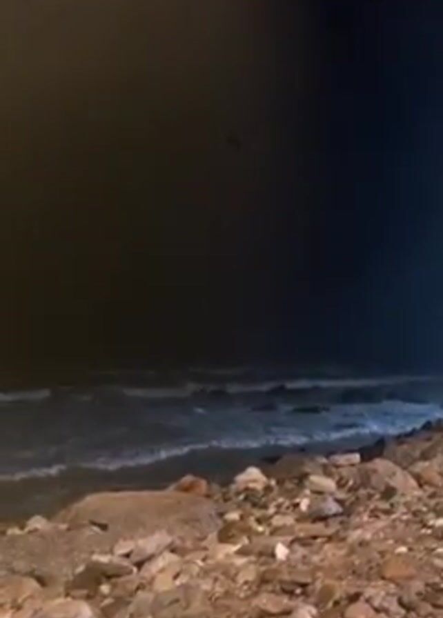 A dimly lit, static shot shows a rocky shoreline at night. The sea is visible, with waves crashing against the shore. In the background, the sky transitions from dark to a lighter, yellowish hue, suggesting artificial lighting or a hazy atmosphere. Around the 0:03 mark, a large beam of light briefly shines downwards from the upper-left corner of the frame, illuminating the sea's surface.