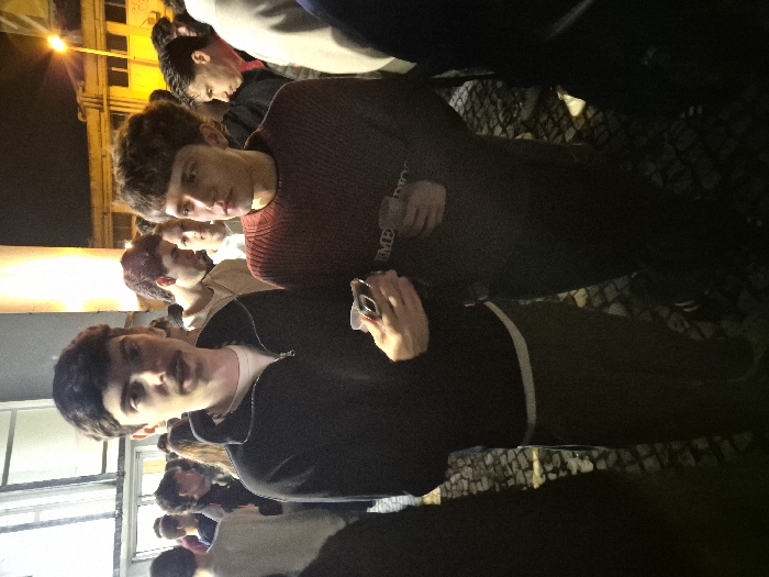 This image captures a nighttime outdoor gathering in Lisbon, Portugal, identified by the traditional Portuguese cobblestone pavement visible on the ground. The scene is densely populated with numerous young individuals under artificial illumination. In the foreground, two young adult males are prominent. The male on the left, with dark hair and a mustache, wears a black quarter-zip sweatshirt over a white t-shirt. He holds a white plastic cup and a dark-cased smartphone in his right hand, looking directly towards the camera. The male on the right, with dark, curly hair styled in a bowl cut, wears a dark red ribbed long-sleeve shirt with partial white text visible on the chest. He holds a clear plastic cup in his right hand, directing his gaze to his right. Behind these two, a dense crowd of additional young adults, predominantly male, occupies the midground and background, standing in close proximity. They are dressed in casual attire. The environment includes a glass-paneled entrance to a building on the left, and indistinct urban structures on the right. Artificial light sources include a bright, upward-projecting light illuminating a background wall and an overhead street light emitting yellow light, confirming the nocturnal setting.