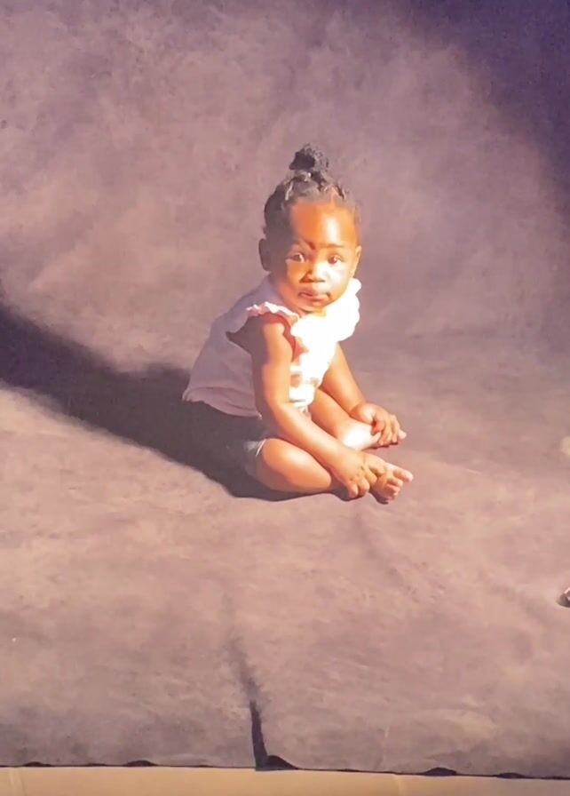 A young child with dark skin and braided hair sits on a brown surface, appearing to be posing for a photograph. The child wears a light-colored top and dark shorts. A shadow is cast behind her. The setting appears to be a makeshift studio with a backdrop, evidenced by a tripod and the legs of someone sitting in the foreground. A voice can be heard speaking in the background.