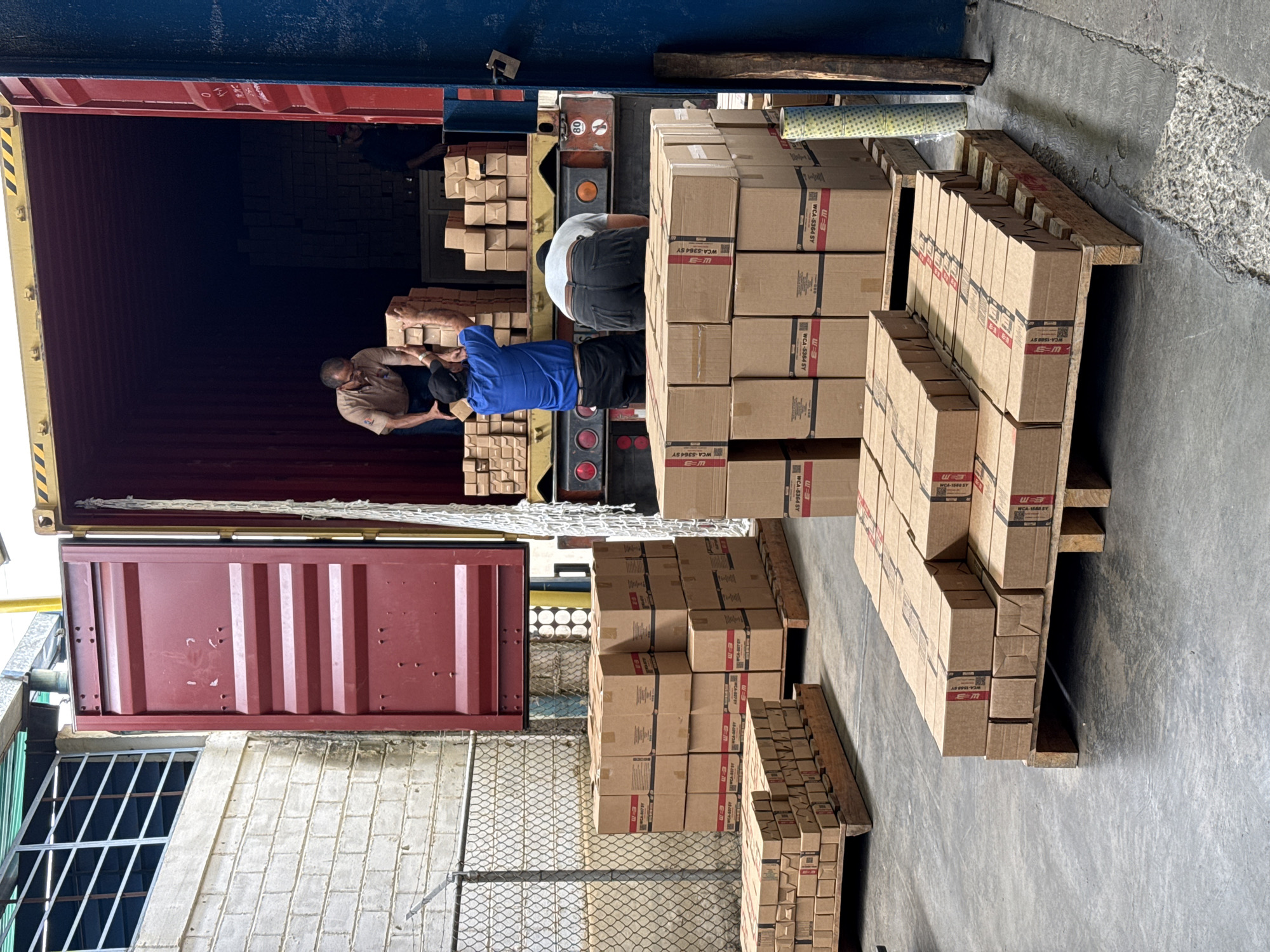 shipping container being unloaded. The container is lined with boxes, and two men are inside passing boxes to a third man who is stacking them onto pallets. The boxes are labeled "WCA-5364 SY" and "WCA-1588 SY" with the logo "E-M." The pallets are on a concrete floor, and there is a fence and a building in the background. The location is Tinaquillo, Venezuela.