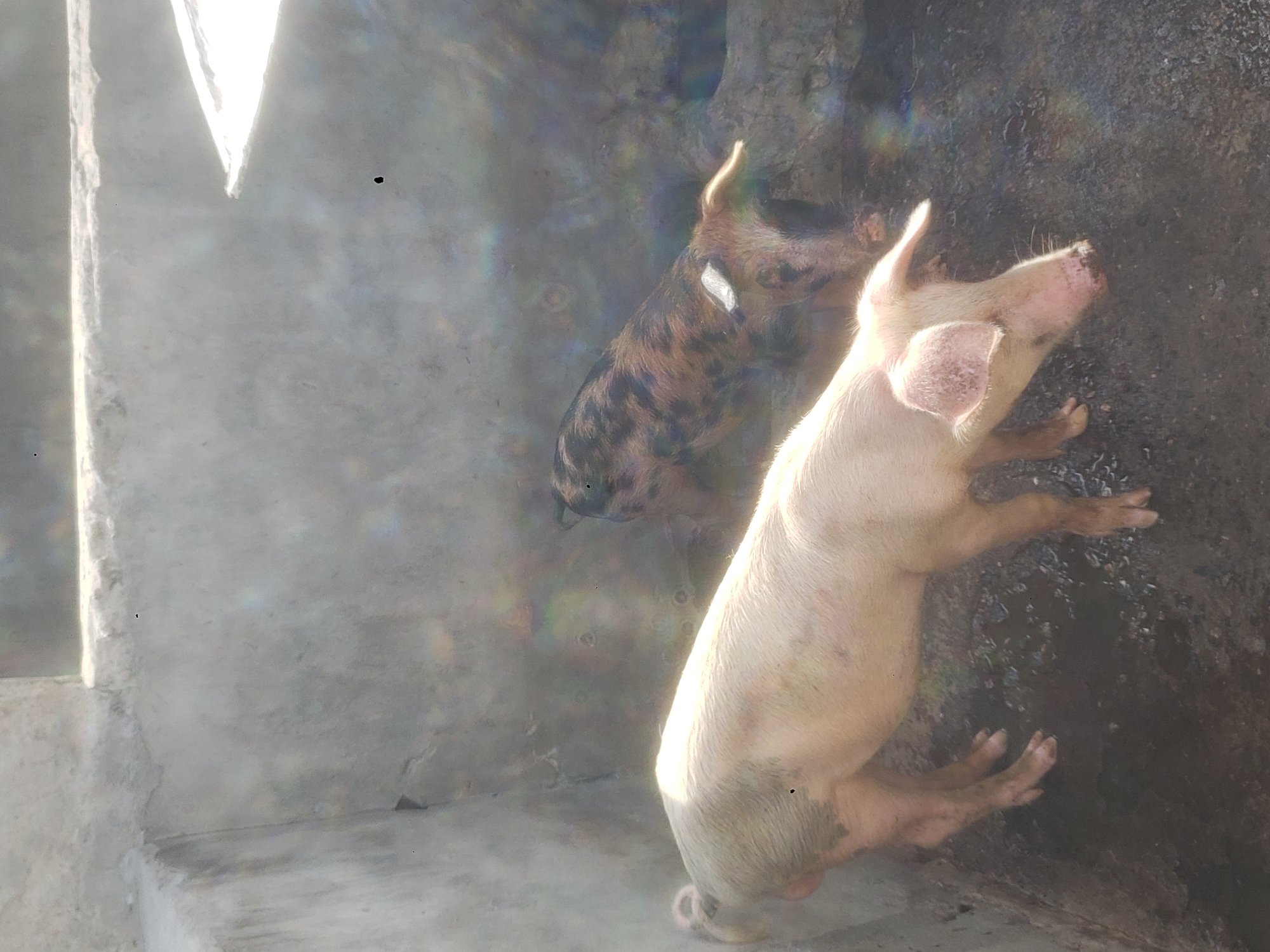 The image displays a concrete pig enclosure located in Badagry, Nigeria. Two pigs are visible within the pen. In the foreground, a larger, light pinkish-beige pig stands on a dark, wet, and muddy ground, with its head oriented downwards and to the right. In the background, a smaller pig with a distinct brown and black spotted or striped coat also stands on the dark ground, facing slightly left with its head lowered. An ear tag is present on the right ear of the spotted pig. The enclosure is constructed of light grey concrete walls, featuring visible ledges or steps along its upper perimeter. Strong natural light illuminates the scene, creating bright reflections and lens flare effects, particularly from the upper right.