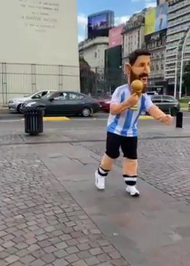 person in an Argentina soccer jersey and a Lionel Messi mascot head, holding the World Cup trophy, walking in front of a tall monument on a brick-paved plaza
