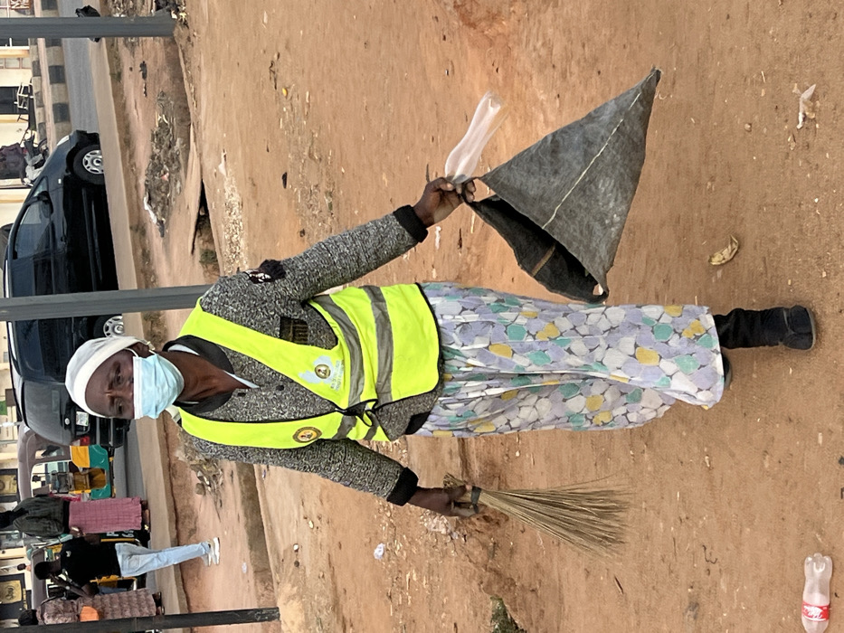 A woman in a yellow reflective vest, a patterned skirt, and a face mask stands on a dirt surface. She holds a broom in one hand and a gray trash bag in the other. A road with vehicles is visible in the background. Several pedestrians with luggage are also in the background to the left. A discarded plastic bottle lies on the ground near her feet.